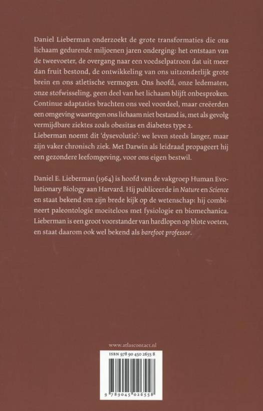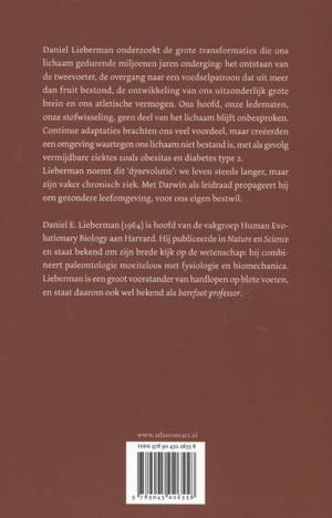 Daniel Lieberman onderzoekt de grote transformaties die ons lichaam gedurende miljoenen jaren onderging: het ontstaan van de tweevoeter, de overgang naar een voedselpatroon dat uit meer dan fruit bestond, de ontwikkeling van ons uitzonderlijk grote brein en ons atletische vermogen. Ons hoofd, onze ledematen, onze stofwisseling, geen deel van het lichaam blijft onbesproken. Continue adaptaties brachten ons veel voordeel, maar creëerden een omgeving waartegen ons lichaam niet bestand is, met als resultaat vermijdbare ziektes zoals obesitas en diabetes type 2. Lieberman noemt dit `dysevolutie : we leven steeds langer, maar zijn vaker chronisch ziek. Met Darwin als leidraad propageert hij een gezondere leefomgeving, voor ons eigen bestwil.