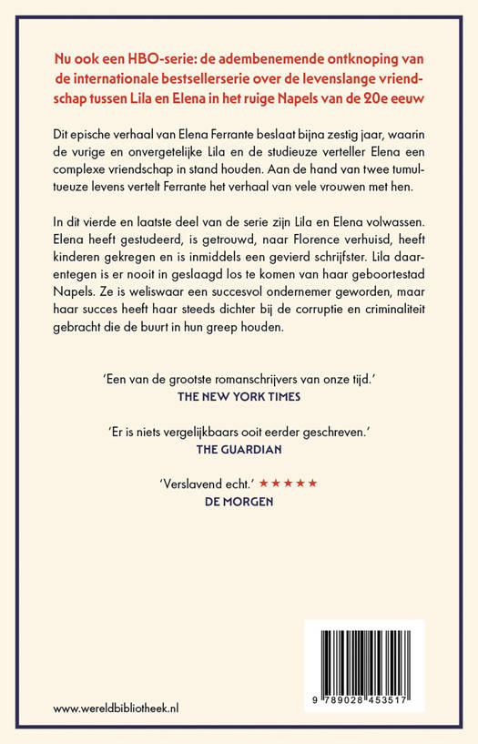 Nu ook een HBO-serie: de adembenemende ontknoping van de internationale bestsellerserie over de levenslange vriendschap tussen Lila en Elena in het ruige Napels van de 20e eeuw Dit epische verhaal van Elena Ferrante beslaat bijna zestig jaar, waarin de vurige en onvergetelijke Lila en de studieuze verteller Elena een complexe vriendschap in stand houden. Aan de hand van twee tumultueuze levens vertelt Ferrante het verhaal van vele vrouwen met hen. In dit vierde en laatste deel van de serie zijn Lila en Elena volwassen. Elena heeft gestudeerd, is getrouwd, naar Florence verhuisd, heeft kinderen gekregen en is inmiddels een gevierd schrijfster. Lila daarentegen is er nooit in geslaagd los te komen van haar geboortestad Napels. Ze is weliswaar een succesvol ondernemer geworden, maar haar succes heeft haar steeds dichter bij de corruptie en criminaliteit gebracht die de buurt in hun greep houden. 'Een van de grootste romanschrijvers van onze tijd.' The New York Times 'Er is niets vergelijkbaars ooit eerder geschreven.' The Guardian 'Verslavend echt.' ***** de Morgen