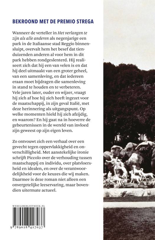 Het verlangen te zijn als alle anderen is een Bildungsroman waarin de hoofdpersoon de band tussen hemzelf en de wereld probeert te begrijpen. Terugkijkend begon het voor de verteller toen hij als negenjarige op een avond een park in een Italiaanse stad binnensloop. Daar overviel hem het besef dat tienduizenden anderen voor hem in het park hadden rondgeslenterd, dat hij een van velen was, dat hij deel uitmaakte van een groter geheel, en dat ook hij zijn steentje moest bijdragen aan het heil ervan. Dat is het begin van een verhaal waarin de verteller, ouder en wijzer, terugkijkt op zijn pogingen zich in te zetten voor de wereld om hem heen, maar tegelijk op afstand wilde blijven. Waar lag voor hem de grens? In hoeverre zijn die gebeurtenissen in de wereld om hem heen van invloed geweest op de loop van zijn eigen leven? Met aanstekelijke ironie en in een sprankelende stijl vertelt Piccolo in deze diepzinnige roman over collectiviteit en individualisme. Over platvloersheid en het streven naar het hogere. Over principes en de verantwoordelijkheid voor de keuzen die wij maken.