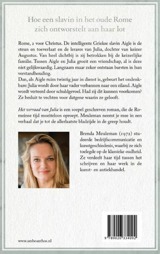 Brenda Meuleman beschrijft in 'Het verraad van Julia' hoe een slavin in de Romeinse tijd zich ontworstelt aan haar lot. De intelligente Griekse slavin Aigle is de lerares van Julia, dochter van keizer Augustus. Tussen Aigle en Julia groeit een vriendschap, al is deze niet gelijkwaardig. Langzaam maar zeker ontstaan barsten in hun verstandhouding. Dan gebeurt het ondenkbare: Julia wordt door haar vader verbannen naar een eiland. Aigle wordt verteerd door schuldgevoel. Had zij dit kunnen voorkomen? Ze besluit te vechten voor datgene waarin ze gelooft. 'Het verraad van Julia' is een levendige historische roman over herkenbare thema's in oude tijden: liefde, vriendschap en verraad. Brenda Meuleman verdeelt haar tijd tussen het schrijven en haar werk in de kunst- en antiekhandel. Het verraad van Julia is haar debuutroman.