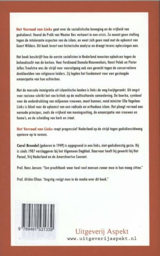 Het Verraad van Links gaat over de socialistische beweging en de vrijheid van godsdienst. De kwestie is brandend actueel door de moorden op Pim Fortuyn en Theo van Gogh, het vertrek van Ayaan Hirsi Ali en de opwinding rond Rita Verdonk en Geert Wilders. Het boek beschrijft hoe de allereerste socialisten in Nederland moeten opboksen tegen de behoudzucht van de kerken. Voor Ferdinand Domela Nieuwenhuis, Henri Polak en Pieter Jelles Troelstra is de strijd voor vooruitgang en tegen armoede ook een gevecht tegende orthodoxe en conservatieve denkbeelden van religieuze leiders. De sociaal-democratie doet haar best om de verzuiling en de hokjesgeest te doorbreken. Na 1960 verdwijnen eindelijk de schridslijnen tussen katholieken, protestanten en buitenkerkelijken. De kerken verliezen hun ijzeren greep op de bevolking. Links speelt een hoofdrol in dit proces. Het komt op voor de emancipatie van vrouwen en homo's. Met de massale immigratie uit islamitische landen raakt de linkse beweging de weg kwijt. Uit angst voor racisme verwerpt zij kritiek op de multiculturele samenleving. De boerka, symbool voor de onderdrukking van miljoenen vrouwen, moet kunnen, vindt minister Ella Vogellar. De PvdA en andere linkse partijen zijn blind voor de opkomst van een radicale en orthodoxe islam. Zij plegen verraad aan hun oerprincipes en laten het afweten op belangrijke terreinen als de homo- en vrouwendrechten en de vrijheid van meningsuiting. Links is in verwarring. Het demoniseren van tegenstanders werkt averechts. Het Verraad van Links roept progressief Nederland op de strijd tegen godsdienstdwang opnieuw op te nemen. Carel Brendel (geboren in 1949) is opgegroeid in een links, nietgodsdienstig gezin. Hij is sinds 1987 verslaggever bij het Algemeen Dagblad. Daarvoor heeft hij gewerket bij Het Parool Vrij Nederland en de Amersfoortse Courant.
