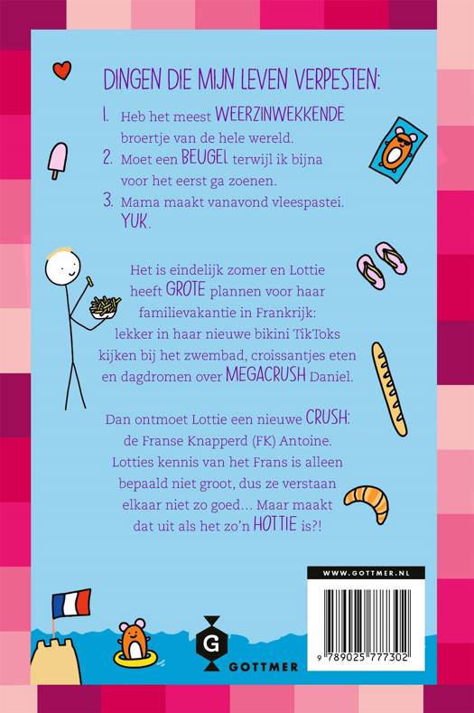 In 'Het verwarrende liefdesleven van Lottie' is de zomervakantie aangebroken en Lottie heeft GROTE plannen, namelijk: in Frankrijk aan het zwembad liggen en door de insta-feed van haar VRIENDJE (ja echt!!) Daniël scrollen. Maar dan, o horror, komt er ineens nóg een megahottie opdagen: de Franse Antoine. Wat nu?