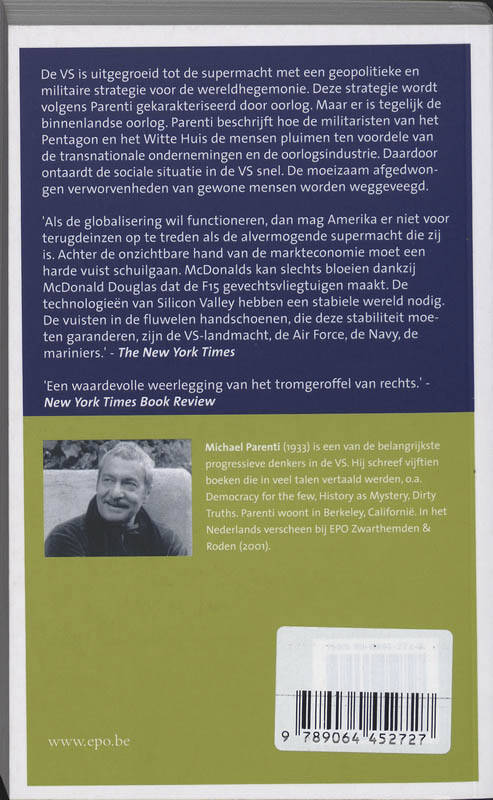 Het Vierde Rijk Of de brutale realiteit van de VS-wereldheerschappij Michael Parenti Een bijzonder en actueel boek The New York Times Book Review over Het Vierde Rijk : "Een waardevolle weerlegging van het tromgeroffel van rechts." De VS is uitgegroeid tot dé supermacht met een geopolitieke en militaire strategie voor de wereldhegemonie. Deze strategie wordt volgens Parenti gekarakteriseerd door oorlog. Maar er is tegelijk de binnenlandse oorlog. Parenti beschrijft hoe de militaristen van het Pentagon en het Witte Huis de mensen pluimen ten voordele van de transnationale ondernemingen en de oorlogsindustrie. Daardoor ontaardt de sociale situatie in de VS snel. De moeizaam afgedwongen verworvenheden van gewone mensen worden weggeveegd. The New York Times schreef het ooit zo: "Als de globalisering wil functioneren, dan mag Amerika er niet voor terugdeinzen op te treden als de alvermogende supermacht die zij is. Achter de onzichtbare hand van de markteconomie moet een harde vuist schuilgaan. McDonalds kan slechts bloeien dankzij McDonald Douglas dat de F15-gevechtsvliegtuigen maakt. De technologieën van Silicon Valley hebben een stabiele wereld nodig. De vuisten in de fluwelen handschoenen, die deze stabiliteit moeten garanderen, zijn de VS-landmacht, de Air Force, de Navy, de mariniers." Parenti begint het boek met de volgende woorden: "De voorbije vier, vijf eeuwen was het imperialisme de drijvende kracht in de wereldgeschiedenis. Het verslond continenten, onderdrukte inheemse bevolkingen en verwoestte talloze beschavingen. Toch ontsnapt het reilen en zeilen van het hedendaagse imperialisme grotendeels aan de aandacht van onze academici, mediacommentatoren en politieke leiders. Vaak doet men alsof het niet eens bestaat. (...) Gewapende imperialistische tussenkomsten worden zogenaamd ingegeven door 'nationale belangen' en 'nationale veiligheid', of moeten een of andere regio 'stabiliseren'. Dit boek gaat op zoek naar de ware aard van het imperialisme. (...)" Inhoudstafel: 1. De ware aard van het imperialisme / 2. Het imperialisme van vandaag / 3. Interventie: lusten en lasten / 4. Sterk imperium, zwakke gemeenschap / 5. Een vreselijk succes / 6. Drugs, leugens en video-oorlogen / 7.Nobele bedoelingen / 8. De macht van het volk en de macht van de staat / 9. Voodoo-economie of de verpaupering van Amerika / 10. Het Vierde Rijk in de academische wereld / 11. Echte alternatieven / Nawoord. Dood aan Irak: het waarom. Michael Parenti is een van de belangrijkste progressieve denkers in de VS. Hij schreef vijftien boeken die in veel talen vertaald werden, o.a. Democracy for the Few, History as Mystery, Dirty Truths . In het Nederlands verscheen bij EPO in 2001 Zwarthemden & Roden. Honderden studenten kwamen naar hem luisteren in Gent, Antwerpen, Brussel en Amsterdam bij de voorstelling van het boek in oktober 2001. Technische kenmerken Titel: Het Vierde Rijk Ondertitel: Of de brutale realiteit van de VS-wereldheerschappij Oorspr.tit.: Against Empire (City Lights Books, San Francisco) Uit het Engels vertaald door Jan Reyniers en Filip Tollenaere (Nawoord) Auteur: Michael Parenti Uitgeverij EPO, Berchem-Antwerpen, 2003 Isbn 90-6445-272-5 Paperback 12,5 x 20 cm - 288 pagina's 22,50 EUR Verschijnt 18 april 2003.