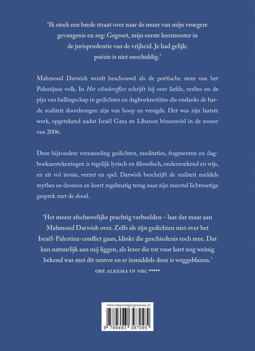 Mahmoud Darwish wordt beschouwd als de poëtische stem van het Palestijnse volk. In 'Het vlindereffect' schrijft hij over liefde, verlies en de pijn van ballingschap in gedichten en dagboeknotities die ondanks de har de realiteit doordrongen zijn van hoop en vreugde. Het was zijn laatste werk, opgetekend nadat Israël Gaza en Libanon binnenviel in de zomer van 2006.