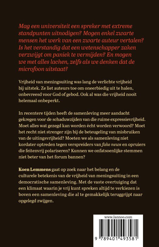 Mag een universiteit een spreker met extreme standpunten uitnodigen? Mogen enkel zwarte mensen het werk van een zwarte auteur vertalen? Is het verstandig dat een wetenschapper zaken verzwijgt om paniek te vermijden? En mogen we met alles lachen, zelfs als we denken dat de microfoon uitstaat? Vrijheid van meningsuiting was lang de verlichte vrijheid bij uitstek. Ze liet auteurs toe om oneerbiedig uit te halen, onbevreesd voor God of gebod. Ook al was die vrijheid nooit helemaal onbeperkt. In recentere tijden heeft de samenleving meer aandacht gekregen voor de schaduwzijden van die ruime expressievrijheid. Moet alles wat gezegd kan worden écht worden verwoord? Moet het recht niet strenger zijn bij de beteugeling van misbruiken van de uitingsvrijheid? Moeten we als samenleving niet kordater optreden tegen verspreiders van fake news en opruiers die feitenvrij polariseren? Kunnen we onfatsoenlijke stemmen niet beter van het forum bannen? Koen Lemmens gaat op zoek naar het belang en de culturele betekenis van de vrijheid van meningsuiting in een democratische samenleving. Met de vaste overtuiging dat een klimaat waarin je vrij kunt spreken altijd te verkiezen is boven een samenleving die al te gemakkelijk teruggrijpt naar opgelegd zwijgen.