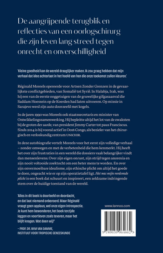'Kleine goedheid kan de wereld draaglijker maken. Ik zou graag hebben dat mijn verhaal dat idee achterlaat in het hoofd van hen die onze toekomst zullen kleuren.' Réginald Moreels opereerde voor Artsen Zonder Grenzen in de gevaarlijkste conflictgebieden, van Somalië tot Syrië. In Halabja, Irak, was hij een van de eerste oogetuigen van de gruwelijke gifgasaanval die Saddam Hoessein op de Koerden had laten uitvoeren. Op missie in Sarajevo werd zijn auto doorzeefd met kogels. In de jaren 1990 was Moreels ook staatssecretaris en minister van Ontwikkelingssamenwerking. Hij bepleitte altijd het lot van de zwaksten bij de groten der aarde, van president Jimmy Carter tot paus Franciscus. Sinds 2014 is hij vooral actief in Oost-Congo, als bezieler van het chirurgisch en verloskundig centrum UNICHIR. In deze autobiografie vertelt Moreels voor het eerst zijn volledige verhaal - zonder omwegen en met de verbetenheid die hem kenmerkt. Hij heeft het over zijn frustraties in een wereld die dossiers vaak belangrijker vindt dan mensenlevens. Over zijn eigen onrust, zijn strijd tegen anorexia en zijn nooit voltooide zoektocht om een beter mens te worden. En over zijn onvermoeibare idealisme, zijn ethische plicht om altijd het goede te doen, ongeacht wie er op zijn operatietafel ligt. Het was mijn verdomde plicht is een boek dat schuurt en inspireert, een zeldzame indringende stem over de huidige toestand van de wereld.