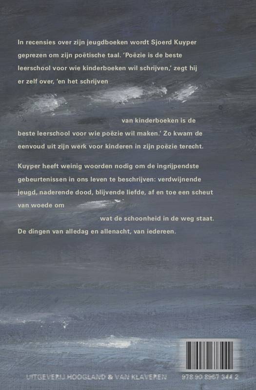 In recensies over zijn jeugdboeken wordt Sjoerd Kuyper geprezen om zijn poëtische taal. ‘Poëzie is de beste leerschool voor wie kinderboeken wil schrijven,’ zegt hij er zelf over, ‘en het schrijven van kinderboeken is de beste leerschool voor wie poëzie wil maken.’ Zo kwam de eenvoud uit zijn werk voor kinderen in zijn poëzie terecht. Kuyper heeft weinig woorden nodig om de ingrijpendste gebeurtenissen in ons leven te beschrijven: verdwijnende jeugd, naderende dood, blijvende liefde, af en toe een scheut van woede om wat de schoonheid in de weg staat. De dingen van alledag en allenacht, van iedereen.