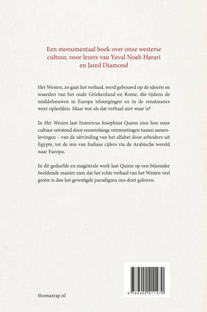 Het Westen is een baanbrekend boek dat het traditionele verhaal van de westerse beschaving volledig herziet. Quinn onderzoekt hoe de oude wereld, van de bronstijd tot de verlichting, werd gevormd door voortdurende wereldwijde ontmoetingen en uitwisselingen. In plaats van de gebruikelijke opvatting van afzonderlijke ‘beschavingen’, laat Quinn zien dat het contact tussen verschillende samenlevingen – van het ontstaan van het alfabet in Egypte tot de intrede van Indiase cijfers in Europa – de échte motor van de geschiedenis was. Een monumentaal werk dat het beeld van de westerse geschiedenis voor altijd zal veranderen.