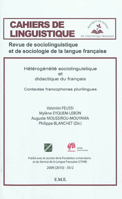 FEUSSI Valentin et BLANCHET : Philippe Entre norme (s) et efficacité didactique / DOMPMARTIN-NORMAND Chantal et THAMIN Nathalie : Poids des normes, représentations et attitudes envers les langues en contexte professionnel plurilingue / MOUSSIROU-MOUYAMA Auguste : Hétérogénéité de l’Afrique et réussite sociale. Que peut-on faire avec la linguistique pour lutter contre l’échec scolaire en afrique francophone ? / EYQUEM-LEBON Mylène : Le traitement des énoncés créoles et « mélangés » par quelques enseignants...