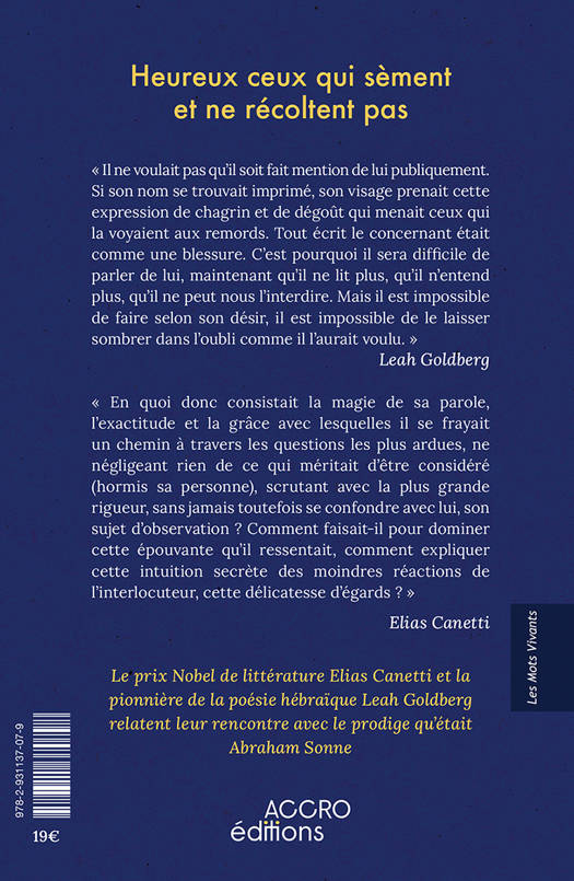 Imaginez un homme, un poète, qui au cours de sa vie ne publie que onze poèmes. Rien que onze poèmes, en hébreu - une langue qui renaît après des millénaires d'oubli. Contre toute attente, son auteur se voit aussitôt reconnu par ses pairs comme l'un des poètes les plus doués et audacieux en ce début de XXe siècle. Abraham Sonne, ou Abraham Ben-Yitzhak sous son nom de plume, incarne alors l'espoir de l'ancienne langue ressuscitée. Mais cet espoir ne se concrétisera que partiellement, car Ben-Yitzhak cesse complètement de publier pendant douze longues années. Puis, en 1928, il réapparaît avec un dernier poème, intitulé « Heureux ceux qui sèment et ne récoltent pas ». Alors Ben-Yitzhak cède la place au « Dr. Sonne ». Le premier rejoint l’Olympe des lettres, le second fréquente, tous les jours à la même table, le Café Museum de Vienne. "Avec son regard d’ascète et son visage émacié, cet homme réservé mais doté d’un charisme singulier, qui avait écrit peu et à contrecoeur, impressionnait – par son érudition, son intelligence, et surtout par ses silences épiques – des intellectuels tels que Hermann Broch, Elias Canetti, James Joyce, Soma Morgenstern, Arthur Schnitzler, Robert Musil, Hugo von Hofmannsthal, le musicien Arnold Schönberg, le peintre Georg Merkel..." (Marco Filoni, La Repubblica) Fascinés par le personnage, le prix Nobel de littérature Elias Canetti et la pionnière de la poésie hébraïque Leah Goldberg ont relaté de leurs plumes vivaces leurs tête-à-tête avec cet esprit exceptionnellement vaste et profond : Canetti dans la Vienne d'avant l’Anschluss, épicentre de la culture européenne, et Goldberg ensuite, à Jérusalem et dans la ville moderniste de Tel-Aviv. Leurs récits accouplés ici en un même ouvrage se lisent telle une oeuvre de fiction tant la tension y est forte et y vibre la passion. Face au Dr. Sonne, écrit Canetti, "on sentait cette supériorité intangible qui faisait que quand il avait épuisé un argument on se sentait illuminé." Pour Goldberg, Sonne était "le premier poète hébreu dont l’horloge n’indiquait pas seulement l’heure aux Hébreux, mais scandait le temps de la littérature mondiale." Chapitre 1 : « L''Homme bon », de Elias Canetti, traduction de l’allemand, Walter Weideli (© Albin Michel) Chapitre 2 : « Rencontre avec un poète », de Leah Goldberg, traduction de l’hébreu, Dan Drai (© Accro Éditions) Préface : Marco Filoni