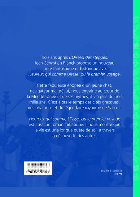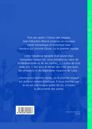 Avec Heureux qui comme Ulysse, ou le premier voyage, Jean-Sébastien Blanck et Sebastian Giacobino vous transportent au coeur de la Méditerranée antique, et de ses légendes... Il raconte le long voyage d'Ulysse qui est ici un jeune chat d'une île de la Grèce antique. Celui-ci est embarqué - malgré lui - sur un navire de pêcheurs qui se perd en mer au cours d'une effroyable tempête. Ulysse et les marins traversent alors des archipels d'îles peuplées de harpies ou de crétaures monstrueuses. Ils dérivent jusqu'en Egypte, et cherchent le chemin du retour pendant près 5 ans jalonnés d'épreuves, de découvertes et d'aventures qui les entraîneront jusqu'au légendaire royaume de Sébès, allusion au royaume de Saba. Bien qu'il ne soit pas une adaptation de l'Odyssée, ce roman très bien illustré est une "passerelle" vers la mythologie et l'univers de la Méditerranée antique."Heureux qui comme Ulysse, ou le premier voyage" poursuit la série de romans de voyage de Jean-Sébastien Blanck pour les fin primaire et début collège, inaugurée en 2007 avec le roman "L'Oiseau des steppes" . La série s'est poursuivie avec trois autres romans chacun en deux volumes : "La Légende véritable du roi d'Orient, ou le second voyage" , "Les Naufragés de la Cité d'Or, ou le troisième voyage" et, "Zéphyr, ou le quatrième voyage"
