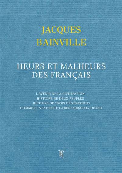 Heurs et Malheurs des Français, publié en 1924, contenait originellement L'avenir de la civilisation (1922), Histoire de deux peuples (1915), Histoire de trois générations (1918) et Histoire de France (1924). Sont intégrés dans cette édition les trois premiers textes susnommés, ainsi que Comment s'est faite la Restauration de 1814 (1914)...