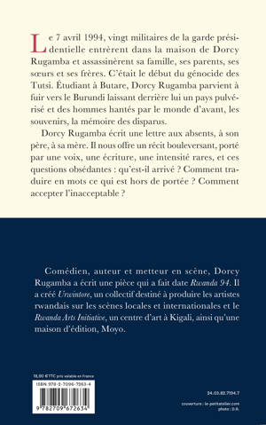 Le 7 avril 1994, vingt militaires de la garde présidentielle entrèrent dans la maison de Dorcy Rugamba et assasinèrent sa famille, ses parents, ses soeurs et ses frères. C'était le début du génocide des Tutsi. Étudiant à Butare, Dorcy Rugamba parvient à fuir vers le Burundi laissant derrière lui un pays pulvérisé et des hommes hantés par le monde d'avant, les souvenirs, la mémoire des disparus. Dorcy Rugamba écrit une lettre aux absents, à son père, à sa mère. Il nous offre un récit bouleversant, porté par une voix, une écriture, une intensité rares, et ces questions obsédantes : qu'est-il arrivé ? Comment traduire en mots ce qui est hors de portée ? Comment accepter l'inacceptable ?