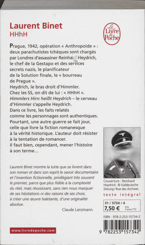 Prague, 1942, opération « Anthropoïde » deux parachutistes tchèques sont chargés par Londres d'assassiner Reinhard Heydrich, le chef de la Gestapo et des services secrets nazis, le planificateur de la Solution finale, le « bourreau de Prague ». Heydrich, le bras droit d'Himmler. Chez les SS, on dit de lui: « HHhH ». Himmlers Hirn heiβt Heydrich - le cerveau d'Himmler s'appelle Heydrich. Dans ce livre, les faits relatés comme les personnages sont authentiques. Pourtant, une autre guerre se fait jour, celle que livre la fiction romanesque à la vérité historique. L'auteur doit résister à la tentation de romancer. Il faut bien, cependant, mener l'histoire à son terme...