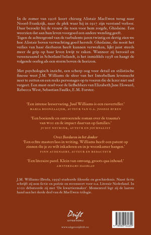 Met psychologisch inzicht, een scherp oog voor detail en stilistische finesse weet J.M. Williams de sfeer van het Interbellum levensecht neer te zetten en een reeks personages op te voeren die de lezer niet snel vergeet. Een must-read voor de liefhebbers van Elizabeth Jane Howard, Rebecca West, Sebastian Faulks, E.M. Forster.