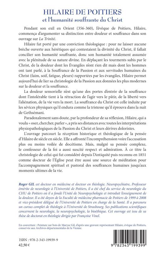 Pendant son exil en Orient (356-360), l'évêque de Poitiers, Hilaire, commença d'argumenter sa distinction entre douleur et souffrance. Pour ne laisser aucune brèche ouverte aux hérétiques qui contestaient la divinité du Christ, il fallait concilier son humanité souffrante avec la plénitude de sa nature divine. En déplaçant les tourments subis par le Christ, Hilaire permet aujourd'hui de lier sa christologie de la Passion aux données les plus modernes sur la douleur et la souffrance. Paradoxalement, Hilaire a pris ses distances avec toutes les interprétations physiopathologiques de la Passion du Christ et leurs dérives doloristes. L'ouvrage parcourt la réception historique et théologique de la pensée d'Hilaire.