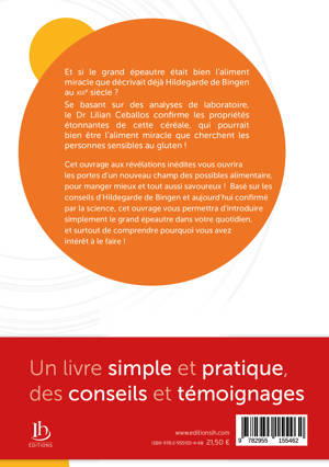Et si, comme le disait déjà Hildegarde de Bingen au douzième siècle, le grand épeautre était un aliment miracle, notamment pour les personnes sensibles au gluten ? C'est pour répondre à cette question que le chercheur et pharmacologue Lilian Ceballos, sur la base d'analyses réalisées par un laboratoire indépendant, a effectué des études comparative de différentes céréales. Dans cet ouvrage simple et accessible, il présente les étonnants résultats de ses recherches, donne des conseils et livre des témoignages étayant ses résultats. Avec ce livre, il confirme par la science l'un des enseignements fondamentaux qu'Hildegarde de Bingen nous a légués il y a plus de huit cents ans. Hildegarde de Bingen, abbesse du Moyen-Âge considérée comme la première naturopathe européenne, a écrit de nombreux livres inspirés et inspirants pour notre siècle. Elle nous transmet de précieux conseils de plus en plus d'actualité.