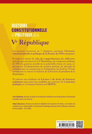 Ce manuel, structuré en 7 chapitres, présente l’histoire constitutionnelle et politique de la France de 1958 à nos jours.