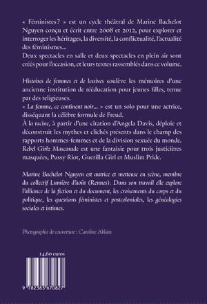 «Â Féministes ? » est un cycle théâtrale de Marine Bachelot Nguyen pour explorer et interroger les héritages, la diversité, la conflictualité, l'actualité des féminismes⦠Deux spectacles en salle et deux spectacles en plein air ont été créés pour l'occasion. «Â Histoires de femmes et de lessives » raconte les mémoires de personnes ayant vécues dans une ancienne institution de rééducation pour jeunes filles, tenue par des religieuses. «Â La femme, ce continent noir... » est un solo pour une actrice qui dissèque la célèbre formule de Freud. «Â A la racine » extrapole à partir d'une citation d'Angela Davis les mythes et clichés présents dans le champ des rapports hommes-femmes et de la division sexuée du monde. «Â Rebel Girlz Mascarade » est une fantaisie pour trois justicières masquées, Pussy Riot, Guerilla Girl et Muslim Pride.