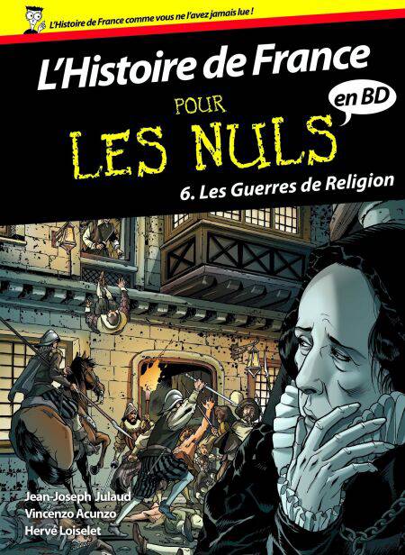 L'histoire de France comme vous ne l'avez jamais lue ! La collection " Pour les Nuls " vous propose un nouveau rendez vous avec l'Histoire de France, en BD ! Dans ce tome 6, découvrez les moments forts de notre passé, pour comprendre les grands événements et se repérer dans notre histoire de façon claire, ludique et didactique. Dans cet album, revivez les guerres de religions, le massacre de la Saint-Bathélémy, rencontrez Catherine de Médicis, Henri III et sa cour et enfin le roi Henri IV. Suivez-nous pour un grand voyage dans le temps. Magnifiquement dessinée par Vincenzo Acunzo et scénarisée par Hervé Loiselet, l'adaptation en bandes dessinées du best-seller de Jean-Joseph Julaud vous invite à réviser vos classiques. Suivez le guide ! Le " Dummies Man ", la mascotte de la collection " Pour les Nuls " vous guidera à travers les heures glorieuses ou sombres de notre histoire. En prime, à la fin de l'album, un cahier de 9 pages écrit par Jean-Joseph Julaud vous permettra d'approfondir vos connaissances sur la période concernée.