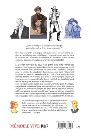 Qui ne connaît pas la bande dessinée belge ? Mais qui connaît le 9e art luxembourgeois ? Petit pays logé entre la Belgique, l'Allemagne et la France, le Grand-Duché de Luxembourg s'est installé dans l'imaginaire pour son rôle dans la politique et l'économie européenne au détriment d'une histoire culturelle pourtant riche et ancienne, notamment côté BD. Bilingue pour le moins, la population luxembourgeoise s'est notamment emparée, au sortir du second conflit mondial, d'une bande dessinée réalisée d'abord dans la langue propre au pays, le luxembourgeois, langue officielle depuis 1984. Ceci explique que les succès des auteurs luxembourgeois (Gab Weis, Roger Leiner et Lucien Czuga) soient passés très largement inaperçus aux yeux du public francophone, en dépit d'un succès local considérable, comparable à celui d'un Astérix en France. la collection Mémoire vive de PLG livre ici son cinquième titre, le Luxembourg succédant à la Suède, à la Pologne, au Chili et à l'Espagne.