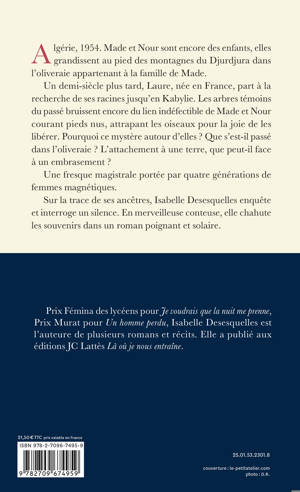 Un demi-siècle plus tard, Laure, née en France, part à la recherche de ses racines jusqu’en Kabylie. Les arbres témoins du passé bruissent encore du lien indéfectible de Made et Nour courant pieds nus, attrapant les oiseaux pour la joie de les libérer. Pourquoi ce mystère autour d’elles ? Que s’est-il passé dans l’oliveraie ? L’attachement à une terre, que peut-il face à un embrasement ?