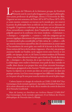 Les lecons de l'Histoire de la litterature grecque de Friedrich Nietzsche sont le cours le plus long parmi ceux que le philosophe, alors jeune professeur de philologie, donna a l'Universite de Bale. Organise sur trois semestres, de l'hiver 1874-1875 a l'hiver 1875-1876, ce cours montre comment ces travaux sur le monde grec ont innerve la pensee du philosophe bien au-dela de son livre sur La Naissance de la tragedie. L'experience esthetique du monde grec est un phenomene d'une extraordinaire complexite, dont l'implacable etrangete devient palpable quand on la confronte a la vision moderne. Litterature, classique, originalite, auteur, voila des categories qui ne peuvent s'appliquer directement a l'experience esthetique du monde ancien. Le malentendu le plus considerable est l'idee meme de culture, telle que nous la connaissons aujourd'hui, liee a la transmission, la conservation et l'accumulation du savoir grace aux outils de la lecture et de l'ecriture. Deux notions de l'art et de la culture s'opposent: d'un cote, une pratique ancienne fondee sur l'oralite, sur le rapport etroit entre l'artiste et son public, son epoque, sa cite; et, de l'autre, la notion moderne de l'homme cultive, issue d'une education litteraire, qui se fonde sur l'etude des textes, des classiques, des Anciens, de ce qui s'est mue en tradition. La dialectique entre oralite et litterature nous parle de deux mondes en conflit, dont chacun a ses propres lois, nees d'une necessite historique. Finalement, qu'apprend-on des Anciens ? Voila la question capitale de ces lecons. La reponse ne se trouve pas dans un savoir positif, ou dans une pratique savante. Les Grecs nous enseignent leur difference irreductible, et c'est pour cela qu'ils sont pour nous les maitres du savoir le plus risque.