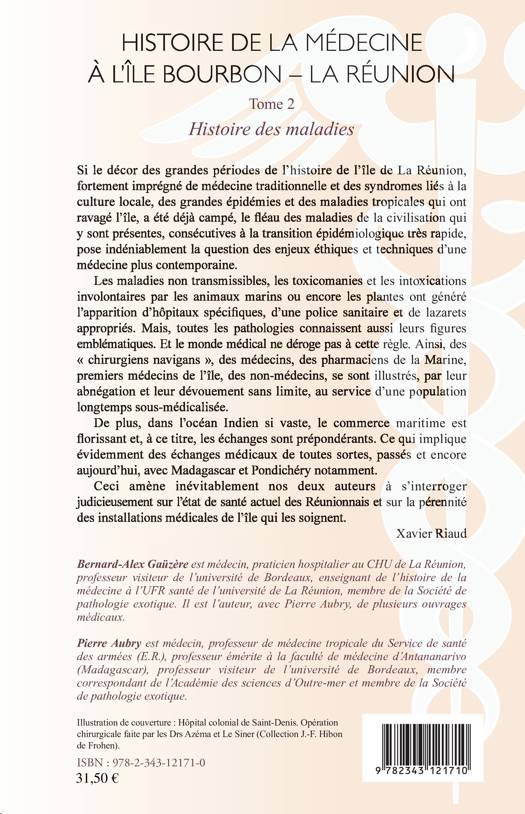Ce deuxième tome aborde les maladies non transmissibles d'un être vivant à un autre être vivant, dont les maladies dites de la civilisation. Entrent ensuite en scène les "chirurgiens navigans", premiers médecins à l'Île Bourbon, puis viennent l'histoire des hôpitaux et des établissements de santé et l'histoire des relations médicales entre La Réunion, Madagascar et Pondichéry. Les auteurs s'interrogent enfin sur l'état de santé actuel des Réunionnais et sur la pérennité des installations médicales de l'île qui les soignent.