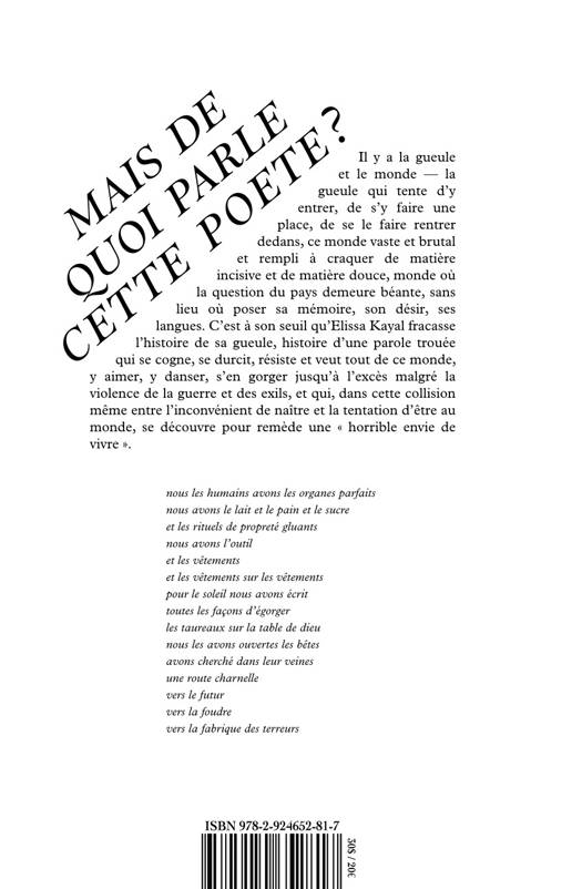 Il y a la gueule et il y a le monde — la gueule qui tente d’y entrer, de s’y faire une place, de se le faire rentrer dedans, ce monde vaste et brutal et rempli à craquer de matière incisive et de matière douce, monde où la question du pays demeure béante, sans lieu où poser sa mémoire, son désir, ses langues. C’est à son seuil qu’Elissa Kayal fracasse l’histoire de sa gueule, histoire d’une parole trouée qui se cogne, se durcit, résiste et veut tout de ce monde : y aimer, y danser, s’en gorger jusqu’à l’excès malgré la violence de la guerre et des exils, et qui, dans cette collision même entre l’inconvénient de naître et la tentation d’être au monde, se découvre pour remède une « horrible envie de vivre ».