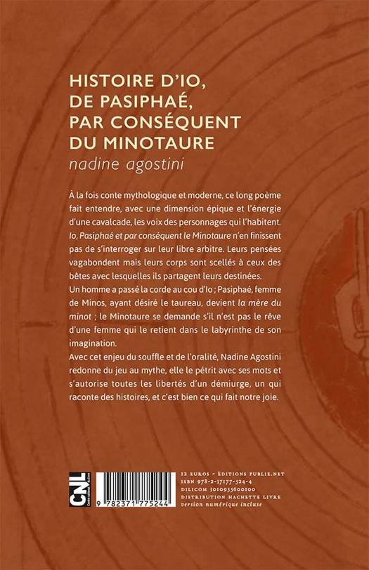 A la fois conte mythologique et moderne, ce long poe me fait entendre, avec une dimension e pique et l’e nergie d’une cavalcade, les voix des personnages qui l’habitent. Io, Pasiphae et par conse quent le Minotaure n’en finissent pas de s’interroger sur leur libre arbitre. Leurs pense es vagabondent mais leurs corps sont scelle s a ceux des be tes avec lesquelles ils partagent leurs destine es.