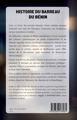 Avec ce livre, les avocats témoins d'une certaine époque retracent avec sens de l'honneur l'anamnèse des fondateurs de leur institution et métier. Du Dahomey colonial au Bénin républicain, ce livre exerçant des créances patrologiques au profit d'aujourd'hui et de demain rappelle, retrace et enseigne comment la défense s'est imposée avec manière comme contre-pouvoir: parole sous tutelle dans la colonie, espoirs et désillusions après 1960, diktats de la Révolution, puis ouverture du Renouveau démocratique. Nourri d'archives, de grands procès et de portraits, il montre comment le Barreau est devenu une conscience publique: rappeler l'État à sa promesse, protéger les libertés, faire tenir le droit dans l'épreuve. Une synthèse claire et rigoureuse, accessible au grand public comme aux praticiens, pour comprendre comment le Barreau éclaire, depuis le Dahomey, les chemins de la République.