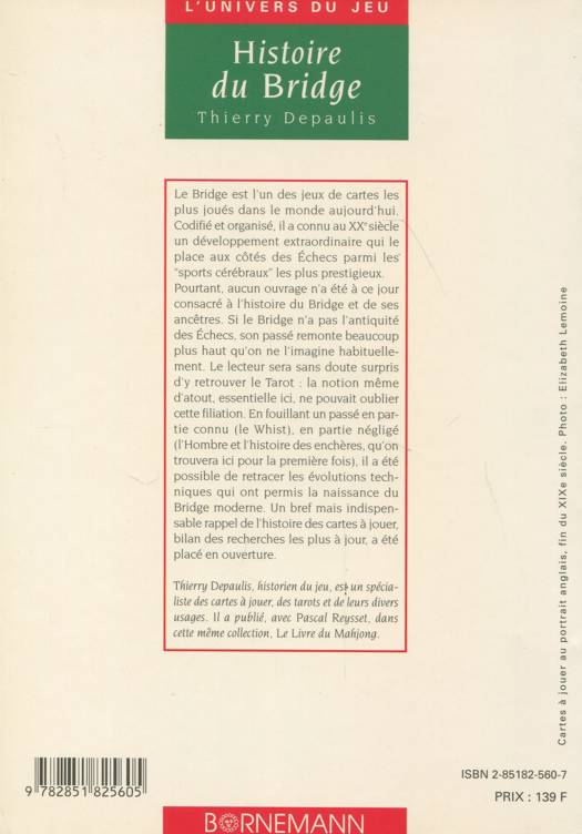 Le Bridge est l'un des jeux de cartes les plus joués dans le monde aujourd'hui. Codifié et organisé, il a connu au XXe siècle un développement extraordinaire qui le place aux côtés des Echecs parmi les " sports cérébraux " les plus prestigieux. Pourtant, aucun ouvrage n'a été à ce jour consacré à l'histoire du Bridge et de ses ancêtres. Si le Bridge n'a pas l'antiquité des Echecs, son passé remonte beaucoup plus haut qu'on ne l'imagine habituellement. Le lecteur sera sans doute surpris d'y retrouver le Tarot : la notion même d'atout, essentielle ici, ne pouvait oublier cette filiation. En fouillant un passé en particulier connu (le Whist), en partie négligé (l'Hombre et l'histoire des enchères, qu'on trouvera ici pour la première fois), il a été possible de retracer les évolutions techniques qui ont permis la naissance du Bridge moderne. Un bref mais indispensable rappel de l'histoire des cartes à jouer, bilan des recherches les plus à jour, a été placé en ouverture.