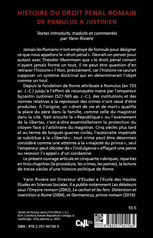 Jamais les Romains n'ont employe de formule pour designer ce que nous appelons le droit penal. Devrait-on penser pour autant avec Theodor Mommsen que le droit penal romain n'ayant jamais forme un tout, il ne peut etre question d'en retracer l'histoire ? Non, precisement, car l'histoire ne sauraitsupposer un systeme doctrinal qui en determinerait l'objet comme un tout. Depuis la fondation de Rome attribuee a Romulus (en 753 av. J.-C.) jusqu'a l'effort de reconquete mene par l'empereur byzantin Justinien (527-565 ap. J.-C.), des institutions et des normes relatives a la repression des crimes n'ont cesse d'etre produites. A l'origine, un droit de vie et de mort qualifie la place du pere dans la famille, comme celle du magistrat dans la cite. Nait ensuite la Republique ou l'avenement de la libertas, c'est-a-dire essentiellement la protection du citoyen face a l'arbitraire du magistrat. Cinq siecles plus tard et au terme de longues guerres civiles, l'autocratie imperiale se substitue a la liberte tout crime peut etre desormais considere comme une atteinte a la majeste du prince; seul l'empereur peut decider de l'indulgence effacant une peine ou recevoir l' appel d'un condamne. Le present ouvrage articule en cinquante rubriques, reparties en trois chapitres (la procedure, les crimes, les peines), la lecture de treize siecles d'une histoire politique de Rome.