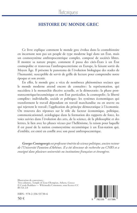 Ce livre explique comment le monde grec évolua dans la cosmohistoire en incarnant non pas un peuple de type moderne logé dans un État, mais un cosmosystème anthropocentrique complet, composé de sociétés libres. Il montre sa nature propre, comment il passa des cités États à un État cosmopolite et transvasa l'anthropocentrisme en Europe, la faisant sortir du Moyen Âge. Il présente le panorama de l'évolution biologique des stades de l'humanité, susceptible de servir de grille de lecture pour comprendre notre époque et son avenir. En effet, le monde grec a vécu de nombreux phénomènes sociaux que le monde moderne attend encore de connaître: la représentation, qui succèdera à la monarchie élective actuelle, et la démocratie; la phase post-statocentrique/oecuménique et son État particulier, la cosmopolis; la liberté complète: individuelle, sociale et politique; les systèmes économiques qui transforment le travail dépendant en travail marchandise ou en oeuvre ou qui rejettent le travail; l'application du principe démocratique à l'économie. On trouvera des réponses sur le rôle du facteur économique, politique, communicationnel, axiologique dans la formation des rapports de force, les voies suivies dans l'évolution des arts, de la science, de la philosophie et des lettres, le lien avec les phases vécues par l'hellénisme, la raison pour laquelle il est passé de la nation cosmosystème oecuménique à un l'État nation qui, d'emblée, est entré en conflit avec son passé anthropocentrique.