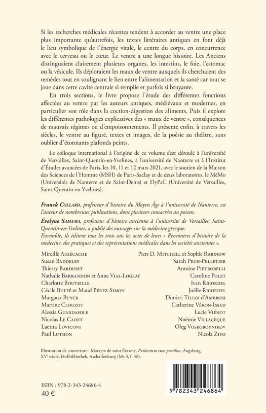 Si les recherches médicales récentes tendent à accorder au ventre une place plus importante qu’autrefois, les textes littéraires antiques en font déjà le lieu symbolique de l’énergie vitale. Le ventre a une longue histoire. Les Anciens déploraient les maux de ventre auxquels ils cherchaient des remèdes tout en soulignant le lien entre l’alimentation et la santé. Le livre propose l’étude des différentes fonctions affectées au ventre par les auteurs antiques, médiévaux et modernes. Puis il explore les différentes pathologies explicatives des « maux de ventre ». Il présente enfin le ventre au figuré, textes et images, de la poésie au théâtre.
