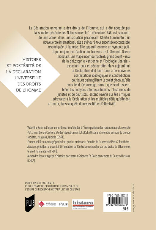 La Déclaration universelle des droits de l'Homme, qui a été adoptée par l'Assemblée générale des Nations unies le 10 décembre 1948, est, soixante-dix ans après, dans une situation paradoxale. Charte humaniste d'un nouvel ordre international, elle a été tour à tour encensée et contestée, revendiquée et ignorée. Elle apparaît comme un symbole politique majeur, en réaction aux horreurs de la Seconde Guerre mondiale, une étape incontournable du grand projet - issu de la philosophie kantienne et l'idéologie libérale - associant paix et démocratie. Mais aujourd'hui, la Déclaration doit faire face à de nouvelles contestations idéologiques et contradictions politiques qui fragilisent le projet global qu'elle sous-tend. Cet ouvrage, dans lequel sont rassemblées les analyses interdisciplinaires d'historiens, de juristes et de politistes, entend revenir sur les critiques adressées à la Déclaration et les multiples défis qu'elle doit affronter, dans sa quête d'universalité et d'effectivité.