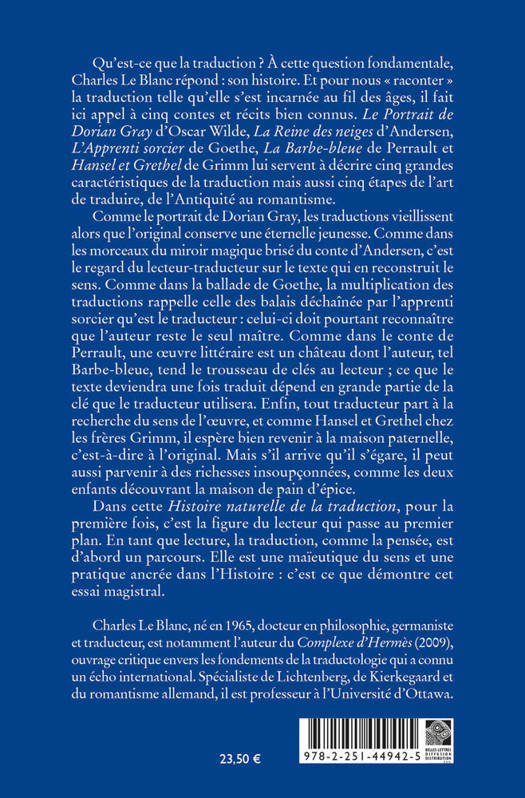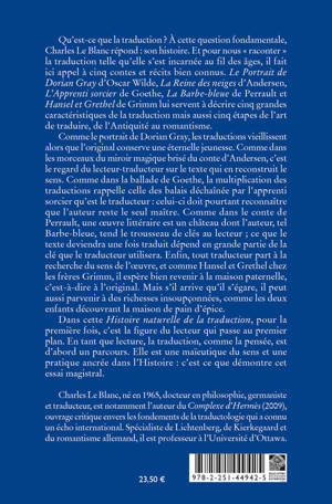 Qu'est-ce que la traduction ? A cette question fondamentale, Charles Le Blanc repond: son histoire. Et pour nous " raconter " la traduction telle qu'elle s'est incarnee au fil des ages, il fait ici appel a cinq contes et recits bien connus. Le Portrait de Dorian Gray d'Oscar Wilde, La Reine des neiges d'Andersen, L'Apprenti sorcier de Goethe, La Barbe-bleue de Perrault et Hansel et Grethel de Grimm lui servent a decrire cinq grandes caracteristiques de la traduction mais aussi cinq etapes de l'art de traduire, de l'Antiquite au romantisme. Comme le portrait de Dorian Gray, les traductions vieillissent alors que l'original conserve une eternelle jeunesse. Comme dans les morceaux du miroir magique brise du conte d'Andersen, c'est le regard du lecteur-traducteur sur le texte qui en reconstruit le sens. Comme dans la ballade de Goethe, la multiplication des traductions rappelle celle des balais dechainee par l'apprenti sorcier qu'est le traducteur: celui-ci doit pourtant reconnaitre que l'auteur reste le seul maitre. Comme dans le conte de Perrault, une uvre litteraire est un chateau dont l'auteur, tel Barbe-bleue, tend le trousseau de cles au lecteur; ce que le texte deviendra une fois traduit depend en grande partie de la cle que le traducteur utilisera. Enfin, tout traducteur part a la recherche du sens de l'uvre, et comme Hansel et Grethel chez les freres Grimm, il espere bien revenir a la maison paternelle, c'est-a-dire a l'original. Mais s'il arrive qu'il s'egare, il peut aussi parvenir a des richesses insoupconnees, comme les deux enfants decouvrant la maison de pain d'epice. Dans cette Histoire naturelle de la traduction, pour la premiere fois, c'est la figure du lecteur qui passe au premier plan. En tant que lecture, la traduction, comme la pensee, est d'abord un parcours. Elle est une maieutique du sens et une pratique ancree dans l'Histoire: c'est ce que demontre cet essai magistral.