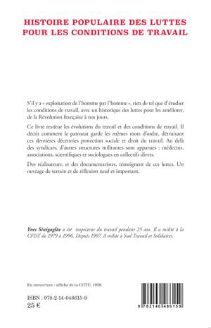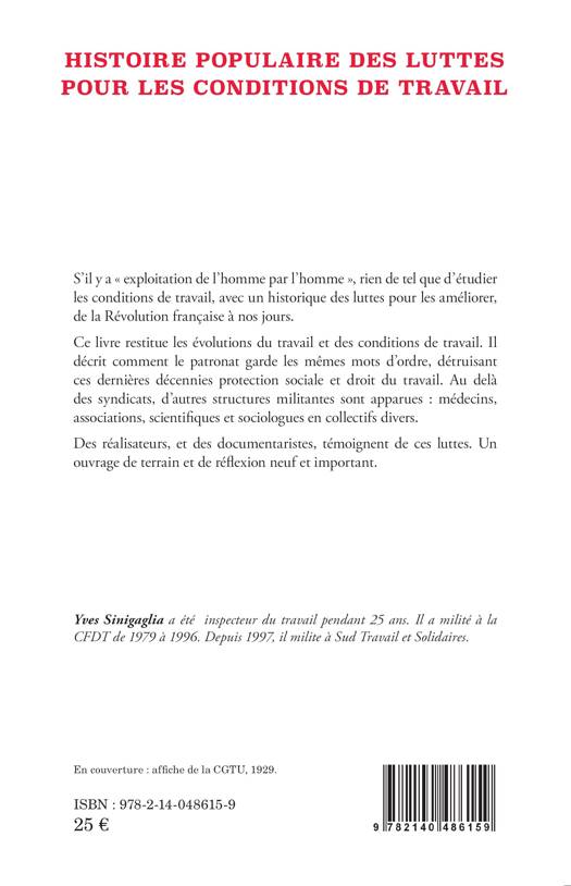S'il y a exploitation de l'homme par l'homme, rien de tel que d'étudier les conditions de travail, avec un historique des luttes pour les améliorer, de la Révolution française à nos jours. Cet ouvrage restitue les évolutions du travail et des conditions de travail. Il décrit comment le patronat garde les mêmes mots d'ordre, détruisant ces dernières décennies protection sociale et droit du travail. Au-delà des syndicats, d'autres structures militantes sont apparues: médecins, associations, scientifiques et sociologues en collectifs divers. Des réalisateurs, et des documentaristes, témoignent de ces luttes. Un ouvrage de terrain et de réflexion neuf et important.