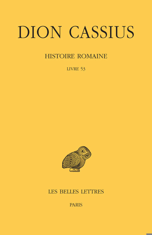 Le livre 53 de l'Histoire romaine de Dion Cassius retrace les evenements des annees 28 a 23 a Rome et hors de Rome, et s'attarde en particulier sur l'annee 27 et la confirmation au pouvoir d'Octave apres la bataille d'Actium. Dion Cassius imagine un discours de pretendu renoncement au pouvoir du futur empereur, qui assure en realite a ce dernier le Principat puis le titre d'Auguste. L'historien se livre ensuite a une analyse tres fine et extremement renseignee des institutions au moment du passage de la Republique au Principat. Cette etude se conclut notamment avec le recit de l'annee 23, dont l'importance pour la mise en place du nouveau regime est bien mise en evidence par Dion. Le present volume est issu de la these de Doctorat de Marion Bellissime - codirigee par Valerie Fromentin et Paul Demont et soutenue a l'Universite Bordeaux Montaigne en 2013 - qui portait sur les livres 52 et 53 de l'Histoire romaine de Dion Cassius. Il est le fruit de la collaboration entre Frederic Hurlet et Marion Bellissime.