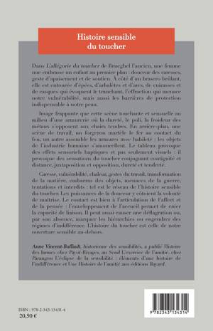 L'histoire sensible du toucher se compose de caresse, vulnérabilité, chaleur, gestes du travail, transformation de la matière... La douceur cotoie la volonté de maitrise. Le contact est à l'articulation de l'affect et de la pensée. Il peut ainsi causer une déflagration, ou par son absence marquer les hierarchies ou engendrer des régimes d'indifférence. L'histoire du toucher est celle de notre ouverture sensible au-dehors.