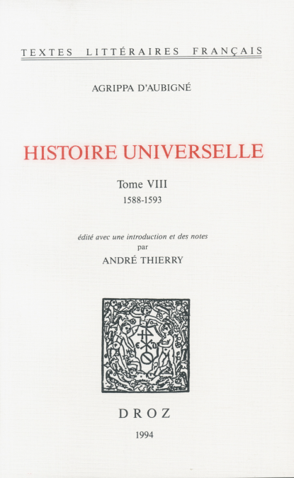 C’est en 1620 lorsqu’il trouve refuge à Genève qu’Agrippa d’Aubigné entreprend de réviser son Histoire Universelle en trois tomes. Amplement corrigée et augmentée, c’est cette seconde version qui est ici éditée, suivant le découpage de Ruble en XV livres. On trouvera dans le dixième et dernier volume de la présente édition le quatrième tome qu’Agrippa d’Aubigné entreprenait d’adjoindre à son ouvrage mais qu’il ne put achever avant la fin de sa vie. Conservés dans les Archives Tronchin, ces textes furent publiés pour la première fois, de manière lacunaire, en 1925, par Jean Plattard. Ces ultima scripta brossent l’image d’un homme à qui le grand âge n’avait rien ôté de la vigueur de son « gros style ferré » et qui demeurait inébranlablement fidèle à la cause pour laquelle il s’était jeté dans la guerre soixante-deux ans plus tôt.