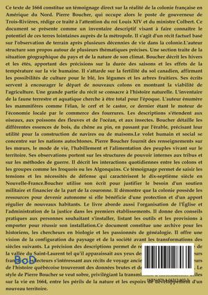 Ce texte de 1664 constitue un témoignage direct sur la réalité de la colonie française en Amérique du Nord. Pierre Boucher, qui occupe alors le poste de gouverneur de Trois-Rivières, rédige ce traité à l'attention du roi Louis XIV et du ministre Colbert. Ce document se présente comme un inventaire descriptif visant à faire connaître le potentiel de ces terres lointaines auprès de la métropole. Il s'agit d'un récit factuel basé sur l'observation de terrain après plusieurs décennies de vie dans la colonie.L'auteur structure son propos autour de plusieurs thématiques précises. Une section traite de la situation géographique du pays et de la nature de son climat. Boucher décrit les hivers et les étés, apportant des précisions sur la durée des saisons et les effets de la température sur la vie humaine. Il s'attarde sur la fertilité du sol canadien, affirmant les possibilités de culture pour le blé, les légumes et les arbres fruitiers. Ses écrits servent à encourager le départ de nouveaux colons en montrant la viabilité de l'agriculture. Une grande partie du récit se consacre à l'histoire naturelle. L'inventaire de la faune terrestre et aquatique cherche à être total pour l'époque. L'auteur énumère les mammifères comme l'élan, le cerf et le castor, ce dernier étant le moteur de l'économie locale par le commerce des fourrures. Les descriptions s'étendent aux oiseaux, aux poissons des fleuves et de l'océan, et aux insectes. Boucher détaille les différentes essences de bois, du chêne au pin, en passant par l'érable, précisant leur utilité pour la construction de navires ou de maisons.Le volet humain et social se concentre sur les nations autochtones. Pierre Boucher fournit des renseignements sur les moeurs, le mode de vie, l'habillement et l'alimentation des peuples vivant sur le territoire. Ses observations portent sur les structures de pouvoir internes aux tribus et sur les méthodes de guerre. Il décrit les interactions quotidiennes entre les colons et les groupes comme les Iroquois ou les Algonquins. Ce témoignage permet de saisir les tensions et les nécessités de défense qui caractérisent le dix-septième siècle en Nouvelle-France.Boucher utilise son écrit pour justifier le besoin d'un soutien militaire et financier de la part de la couronne. Il démontre que la colonie possède les ressources pour devenir autonome si elle bénéficie d'une protection et d'un apport régulier de nouveaux habitants. Le livre aborde aussi l'organisation de l'Église et l'administration de la justice dans les premiers établissements. Il donne des conseils pratiques aux personnes souhaitant s'installer, listant les outils et les provisions à emporter pour réussir son installation.Ce document constitue une archive pour les historiens, les chercheurs en biologie et les passionnés de généalogie. Il offre une vision de la configuration du paysage et de la société avant les transformations des siècles suivants. La précision des descriptions permet de reconstituer l'écosystème de la vallée du Saint-Laurent tel qu'il apparaissait aux yeux des premiers administrateurs français. Les lecteurs s'intéressant aux récits de voyage anciens et aux textes fondateurs de l'histoire québécoise trouveront des données brutes et des observations directes. Le style de Pierre Boucher se veut sobre, privilégiant la transmission d'informations utiles sur la vie en 1664, entre les périls de la nature et les espoirs de développement d'un nouveau territoire.