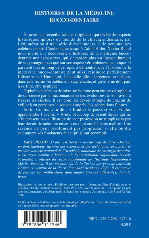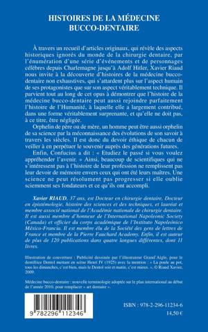 A travers un recueil d'articles originaux, par l'énumération d'une série d'événements et de personnages célèbres depuis Charlemagne jusqu'à Adolf Hitler, Xavier Riaud nous invite à la découverte d'histoires de la médecine bucco-dentaire non exhaustives, qui s'attardent plus sur l'aspect humain de ses protagonistes que son aspect technique. Il parvient à démontrer que l'histoire de la médecine bucco-dentaire peut rejoindre l'histoire de l'Humanité à laquelle elle a largement contribué.