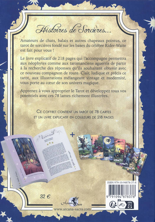 Amateurs de chats, balais et autre chapeaux pointus, ce tarot de sorcières fondé sur les bases du célèbre Rider-Waite est fait pour vous ! Le livre explicatif de 218 pages qui l'accompagne permettra aux néophytes comme aux taromanciens aguerris de partir à la recherche des réponses qu'ils souhaitent obtenir avec ce nouveau compagnon de route. Clair, ludique et précis ce tarot, aux illustrations mélangeant vintage et modernité, vous porte au coeur de son univers magique. Apprenez à vous approprier le Tarot et développez tous vos potentiels avec ces 78 lames richement illustrées.