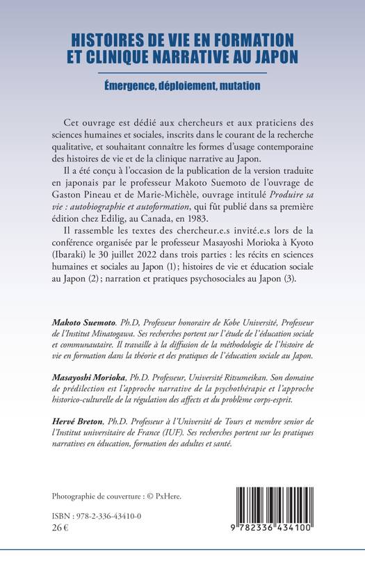 Cet ouvrage est dédié aux chercheurs et aux praticiens des sciences humaines et sociales, inscrits dans le courant de la recherche qualitative, et souhaitant connaître les formes d’usage contemporaine des histoires de vie et de la clinique narrative au Japon. Il a été conçu à l’occasion de la publication de la version traduite en japonais par le professeur Makoto Suemoto de l’ouvrage de Gaston Pineau et de Marie-Michèle, ouvrage intitulé Produire sa vie : autobiographie et autoformation, qui fût publié dans sa première édition chez Edilig, au Canada, en 1983. Il rassemble les textes des chercheur.e.s invité.e.s lors de la conférence organisée par le professeur Masayoshi Morioka à Kyoto (Ibaraki) le 30 juillet 2022 dans trois parties : les récits en sciences humaines et sociales au Japon (1) ; histoires de vie et éducation sociale au Japon (2) ; narration et pratiques psychosociales au Japon (3).