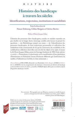 L’histoire des personnes dites handicapées, sourdes ou malades mentales est peu étudiée sur la longue durée. L’ouvrage comble cette lacune en posant les questions — du Paléolithique jusqu’à nos jours — de l’identification des personnes handicapées, de leurs trajectoires personnelles et collectives, des institutions et des communautés de vie qui les concernent, des sociabilités et des mobilisations collectives dont elles sont à la fois les objets et les sujets. Comme le dit Henri-Jacques Stiker, auteur de l’ouvrage fondateur de 1982 Corps infirmes et sociétés : « Prometteuse et réjouissante est la manifestation d’une génération d’historiennes et d’historiens venant d’horizons différents qui s’intéressent à la surdité, à l’infirmité ou à la folie et à leur croisement. »