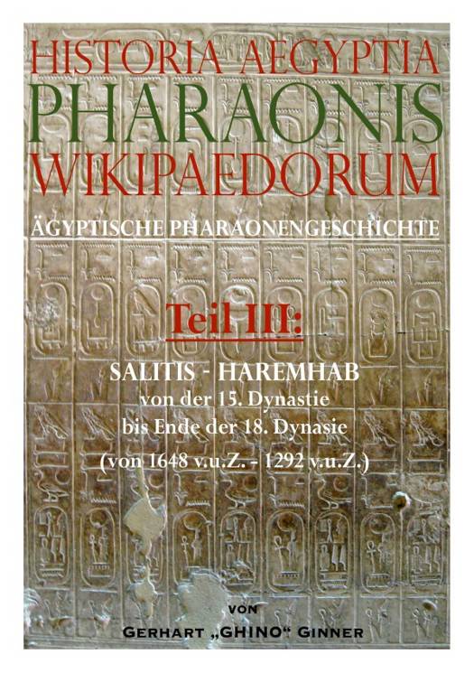In diesem dritten Teil des 4-bändigen Werkes werden die Pharaonenbiographien von Salitis - Haremhab von der 15. Dynastie bis Ende der 18. Dynastie (von 1648 v.u.Z - 1292 v.u.Z) dargestellt: 15.Dynastie (die Hyksoskönige der Fremdländer): Salitis (um 1648 v.u.Z. bis um 1633 v.u.Z.), Beon (um 1633 bis um 1619 v.u.Z.), Apachnas (ca. 1619 bis um 1610 v.u.Z.): Chajan, Apopi I. (etwa 1590 bis um 1549 v.u.Z.), Chamudi (um 1549 - um 1539/35 v.u.Z.):bis NEUES REICH: 18.Dynastie: Ahmose I. ( um 1560 v.u.Z.; 1525 v.u.Z.), Amenophis I. (von 1525 bis etwa 1504 v.u.Z.), Thutmosis I. (etwa 1504 v. Chr. bis 1492 v.u.Z.), Thutmosis II. (etwa 1482 bis 1479 v.u.Z.), Hatschepsut (etwa 1479 bis 1458 v.u.Z.), Thutmosis III. (1479 v.u.Z. - 1425 v.u.Z.), Amenophis II. (von 1428 bis 1397 v.u.Z.), Thutmosis IV. (von 1397 bis 1388 v.), Amenophis III. (etwa 1388 bis um 1351 v.u.Z.), Echnaton (ca. 1351-1334 v.u.Z.), Semenchkare (von 1336-1333 v.u.Z.), Tutanchamun (etwa 1332 bis 1323 v.u.Z.), Eje II. (etwa 1323 bis 1319 v.u.Z.), Haremhab (etwa 1319 bis 1292 v.u.Z.).