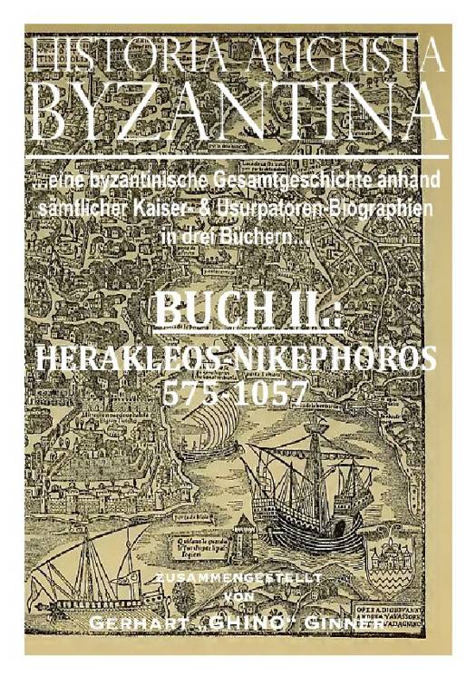 ...sämtliche Kaiser- und Usurpatorenbiographien des byzantinischen Reiches komprimiert auf so wenig Seiten wie möglich, Buch II.: HERAKLEIOS, Komentiolos, Johannes von Compsa, Eleutherius, Vahan, Johannes Athalarich, KONSTANTIN III., HERAKLONAS, KONSTANS II., Maurikios Chartularios, Gregor von Karthago, Olympius, Theodoros Rstuni, Saborios, KONSTANTIN IV., Mizizios, JUSTINIAN II., Georgios, LEONTIOS, TIBERIUS II., PHILIPPIKOS BARDANES, ANASTASIOS II., THEODOSIUS III., LEO III., Basileios Onomagulos, Kosmas, Tiberios Petasius, Pseudo-Tiberios, KONSTANTIN V., Artabasdos, Konstantin Podopaguros, Arichis II., LEO IV., KONSTANTIN VI., Elpidios, Alexios Musele, IRENE VON ATHEN, NIKEPHOROS I., Bardanes Turkos, Arsaber, STAURAKIOS, MICHAEL I., LEO V., MICHAEL III., Karbeas, Boris I., Symbatios, BASILEOS I., LEO VI., ALEXANDER, KONSTANTIN VII., Konstantin Dukas, Simeon I., Leon Phokas der Ältere, ROMANOS I., Bardas Boilas, Basileios Chalkocheir, ROMANOS II., Basileios Peteinos, BASILEIOS II., NIKEPHOROS II., Kalokyres, JOHANNES TZIMISKES, Bardas Phokas der Jüngere, Bardas Skleros, Meles von Bari, Georgios Tzules, Nikephoros Phokas Barytrachelos, KONSTANTIN VIII., Nikephoros Komnenos, Basileios Skleros, ROMANOS III., Presian II., MICHAEL IV., Elpidios Brachamios, Stefan Vojislav, Peter II., Gregorios Taronites, MICHAEL V., ZOE, Theophilos Erotikos, KONSTANTIN IX., Georgios Maniakes, Leon Lampros, Leon Tornikes, Romanos Boilas, THEODORA III., MICHAEL VI., Theodosios Monomachos, Nikephoros Bryennios...Leo, seinen Nachfolger Romanos und Theodora, die mit dem byzantinischen Kaiser Johannes Tzimiskes verheiratet war. Der Kaiser als Schriftsteller Konstantin VII. ist der Nachwelt als Autor in Erinnerung geblieben. Er schrieb oder ließ in seinem Namen drei Werke zur byzantinischen Kaiser auch in mehreren byzantinischen Quellen gewürdigt wurde, diese jedoch nicht erhalten sind. In der Bevölkerung war der Kaiser wohl recht beliebt,