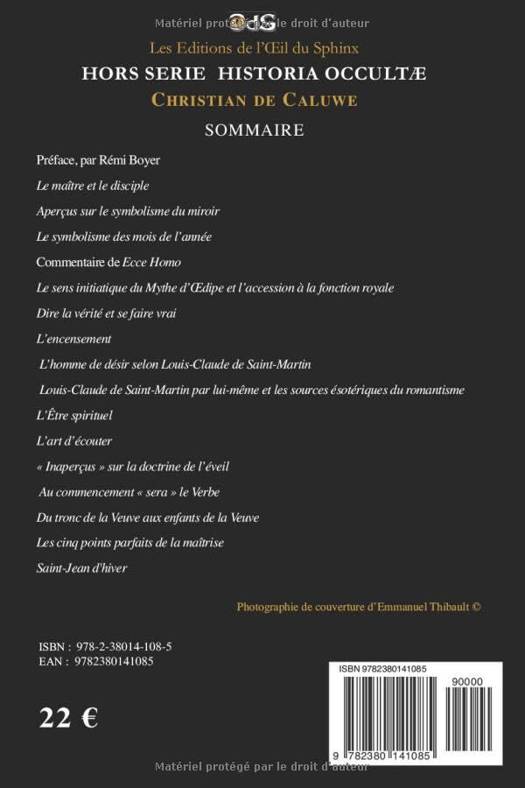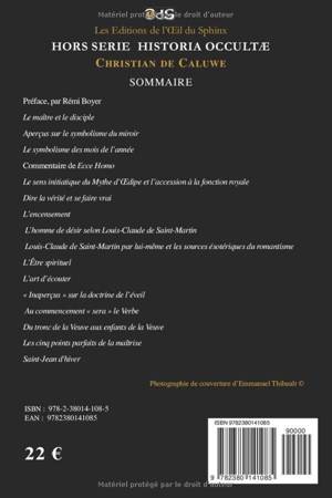 HORS SERIE HISTORIA OCCULTÆ CHRISTIAN DE CALUWE SOMMAIRE Préface, par Rémi Boyer Le maître et le disciple Sur le symbolisme du miroir Le symbolisme des mois de l’année Commentaire de Ecce Homo Le sens initiatique du Mythe d’œdipe et l’accession à la fonction royale Dire la vérité et se faire vrai L’encensement L’homme de désir selon louis-claude de saint-martin Louis-claude de saint-martin par lui-même et les sources ésotériques du romantisme L’Être spirituel L’art d’écouter « Inaperçus » sur la doctrine de l’éveil Au commencement « sera » le Verbe Du tronc de la veuve aux enfants de la veuve Les cinq points parfaits de la maîtrise Saint-Jean d'hiver