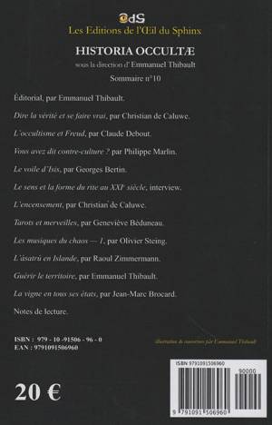 Éditorial, par Emmanuel Thibault. Dire la vérité et se faire vrai, par Christian de Caluwe. L'occultisme et Freud, par Claude Debout. Vous avez dit contre-culture ? par Philippe Marlin. Le voile d'Isis, par Georges Bertin. Le sens et la forme du rite au XXIe siècle, interview par Emmanuel Thibault. L'encensement, par Christian de Caluwe. Tarots et merveilles, par Geneviève Béduneau. Les musiques du chaos - 1, par Olivier Steing. L'ásatrú en Islande, par Raoul Zimmermann. Guérir le territoire, par Emmanuel Thibault. La vigne en tous ses états, par Jean-Marc Brocard. Notes de lecture.